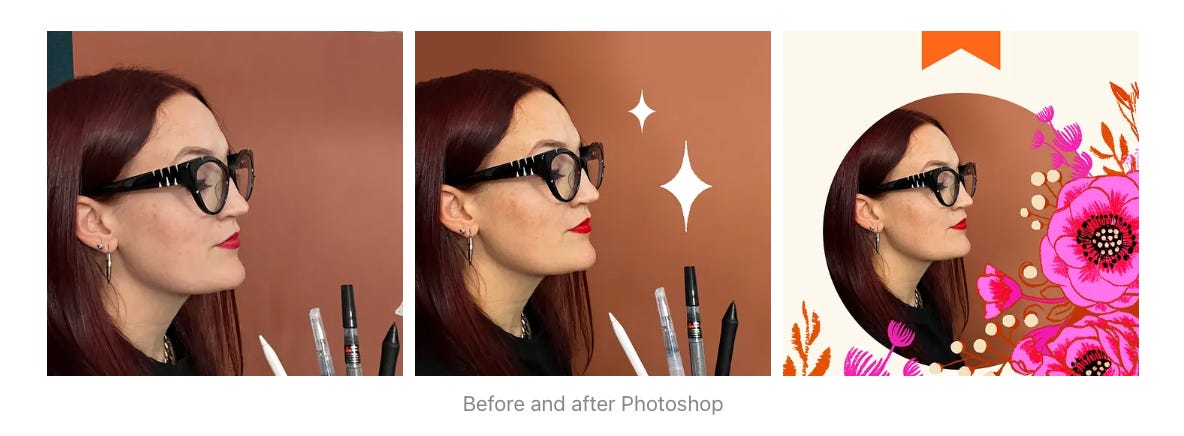 Next month(May), I am doing a demo in Photoshop on how to do basic photo editing for social media. You can join Sketchbook Squad here to attend. For Substack paid subscribers, you can see a 2-minute video of how I did this portrait with Photoshop and $3 in photo props below!